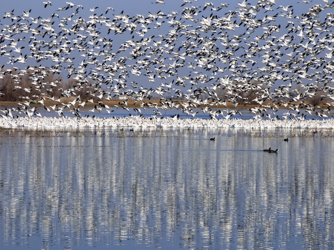 The larger Snow Goose (Chen caerulescens) has a longer beak with a black lip. The geese often flock together in huge numbers. There is nothing quite like seeing tens of thousands take flight all at once.