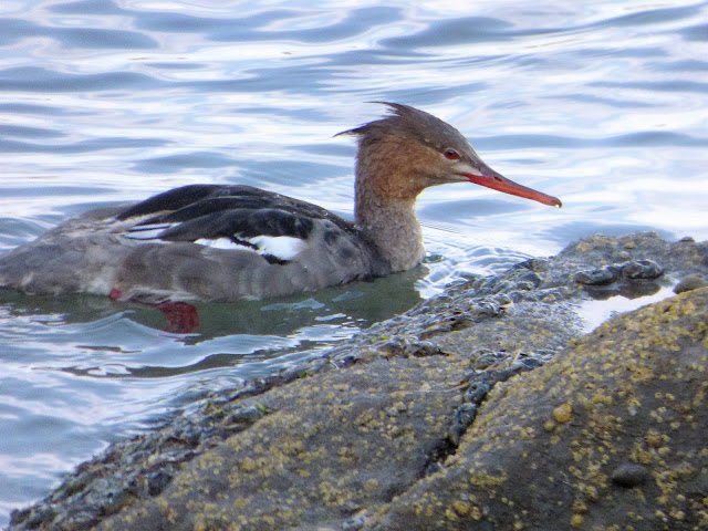 It could be the dog days of summer or something else entirely, but there just haven't been many birds out and about in the places where I've been wandering. The pond at the campus has been dry for months, so few species are hanging out there, and I've only had a few chances to walk the river trail on the Tuolumne, and the birds were scarce there as well. We had occasion to take a short trip to the coast this past weekend though, and when we checked out the Fitzgerald Nature Preserve and Pillar Point Harbor near Half Moon Bay, we saw a few species. One was new to me (I didn't say "uncommon", it's just I haven't seen one yet). It was a Red-breasted Merganser (Mergus serrator). They are seen often enough along the coast of California, but almost never in the interior Central Valley (hence why I haven't noticed any before).